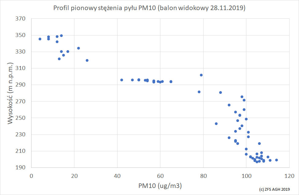 W zeszły czwartek (28.11.2019) udało się dokonać pierwszych pomiarów pyłu zawieszonego, instrumentem zainstalowanym na gondoli Balonu Widokowego. Już w pierwszy dzień pomiarów trafiliśmy na bardzo ciekawą ale jednocześnie, niestety typową dla Krakowa w miesiącach chłodnych, sytuację meteorologiczną. Wykres przedstawia zmierzone stężenia pyłu zawieszonego w funkcji wysokości na jakiej aktualnie znajduje się balon. Jak widać na wysokości około 200 m n.p.m. (poziom lądowiska) stężenia pyłu zawieszonego są zgodne z tym co w godzinach przedpołudniowych obserwowaliśmy na stacjach GIOŚ i wynoszą około 100 µg/m3. Stężenia pyłu utrzymują się na podobnym poziomie, aż do około 100 metrów nad ziemią (300 m n.p.m.) gdzie raptownie spadają niemal do zera. Tym sposobem udało nam się wyznaczyć chwilową wysokość tak zwanej warstwy mieszania, zwanej też „warstwą inwersyjną”. Jest to warstwa, w obrębie której kumulują się wszystkie zanieczyszczenia wyemitowane w Krakowie poniżej. Na atmosferę powyżej warstwy lokalne emisje nie mają wpływu stąd jest ona tak „czysta”.