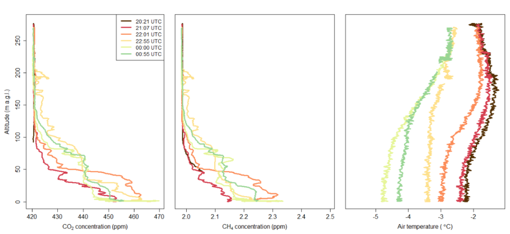 W okresie od marca 2021 do stycznia 2022 prowadzone były raz w miesiącu dobowe pomiary profili pionowych stężenia atmosferycznego dwutlenku węgla i metanu. Badania prowadzone w ramach projektu CoCO2, koordynowanego przez Europejskie Centrum Średnioterminowych Prognoz Pogody (ECMWF), a realizowanego przez 25 instytucji z Europejskich w ramach programu HORIZON 2020, miały na celu dostarczenie trójwymiarowych danych rozkładu zawartości CO2 w atmosferze miejskiej mających na celu opracowanie globalnego systemu do weryfikacji emisji. Kampanie były prowadzone na pokładzie Krakowskiego Balonu Widokowego oraz za pomocą drona. W obu przypadkach platformy pomiarowe były wyposażone w precyzyjny laserowy analizator stężenia CO2 i CH4. W ramach prowadzonych kampanii udało się wykonać 269 lotów do ma. Wysokości 285 m n.p.g. zgrupowanych w 11 kampaniach dobowych. W trakcie każdego lotu poza pomiarami stężeń gazów śladowych, mierzone były również podstawowe parametry meteorologiczne, jak temperatura, wilgotność czy prędkość wiatru. Dzięki temu udało się pozyskać zestawy danych, określających zmienność czasowo-przestrzenną mierzonych parametrów, które można wykorzystać do weryfikacji prognoz symulowanych za pomocą modeli numerycznych atmosfery. Przykładowy zestaw wyników z wybranej kampanii przedstawiony jest na poniższych rysunkach.