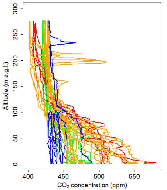 W trakcie wielu wykonywanych profili, w kilku przypadkach udało się zaobserwować piki CO2 występujące na wysokości między 200 a 250m n.p.g., które najprawdopodobniej pochodzą z jakiegoś punktowego źródła emisji związanego z przemysłem (rys poniżej).