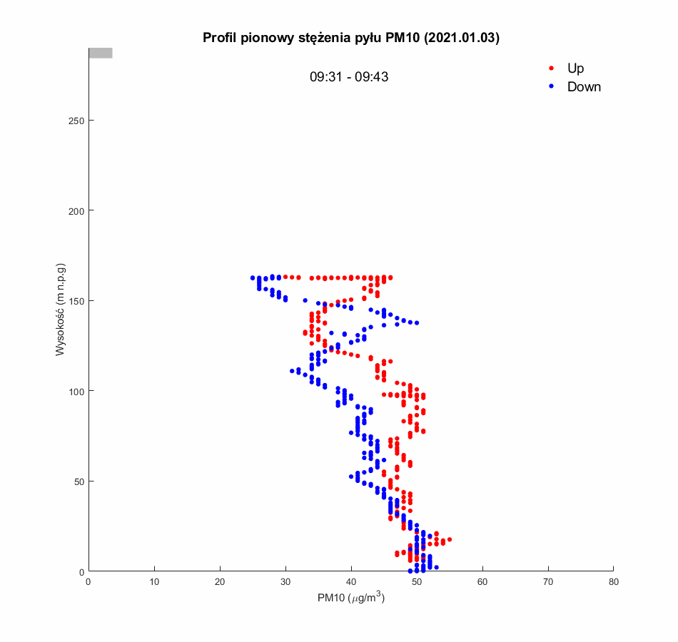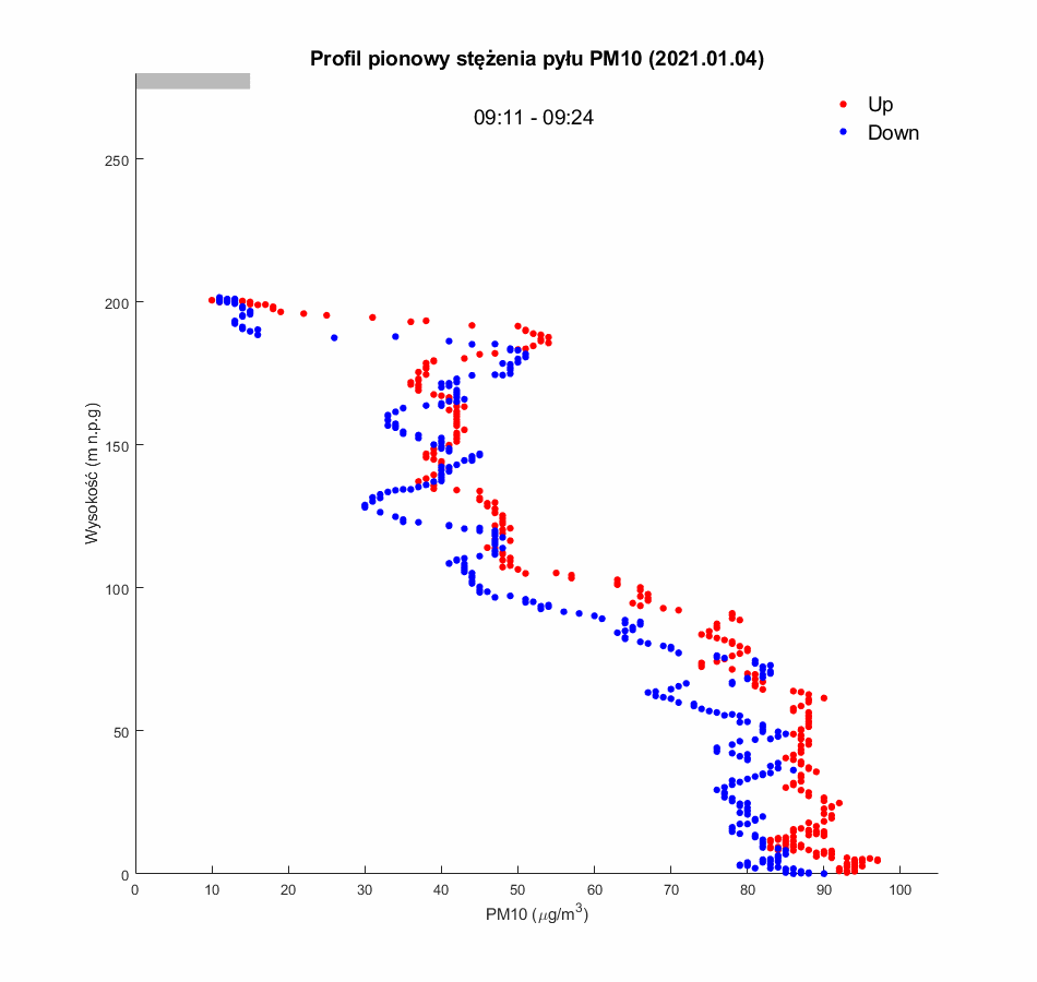 Profile uzyskane z pokładu balonu uzyskane 3 stycznia rano pokazywały stałe stężenia pyłu do wysokości 150 m n.p.g.