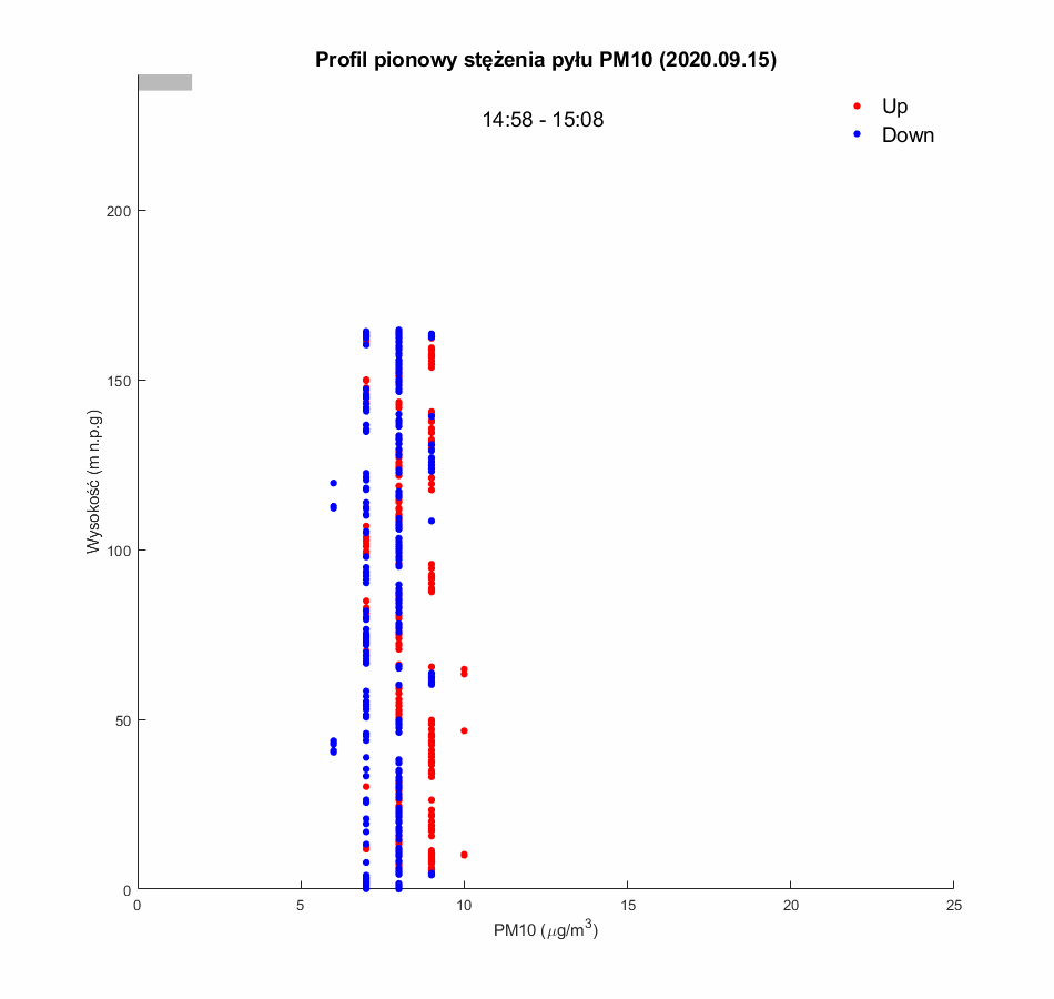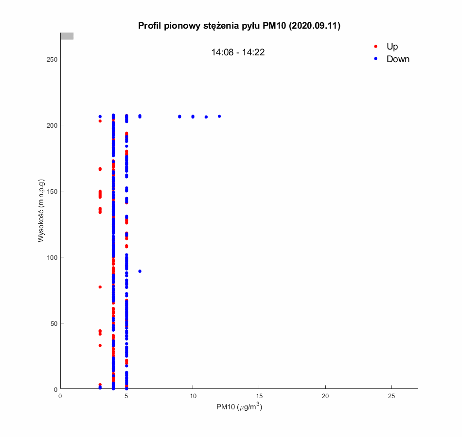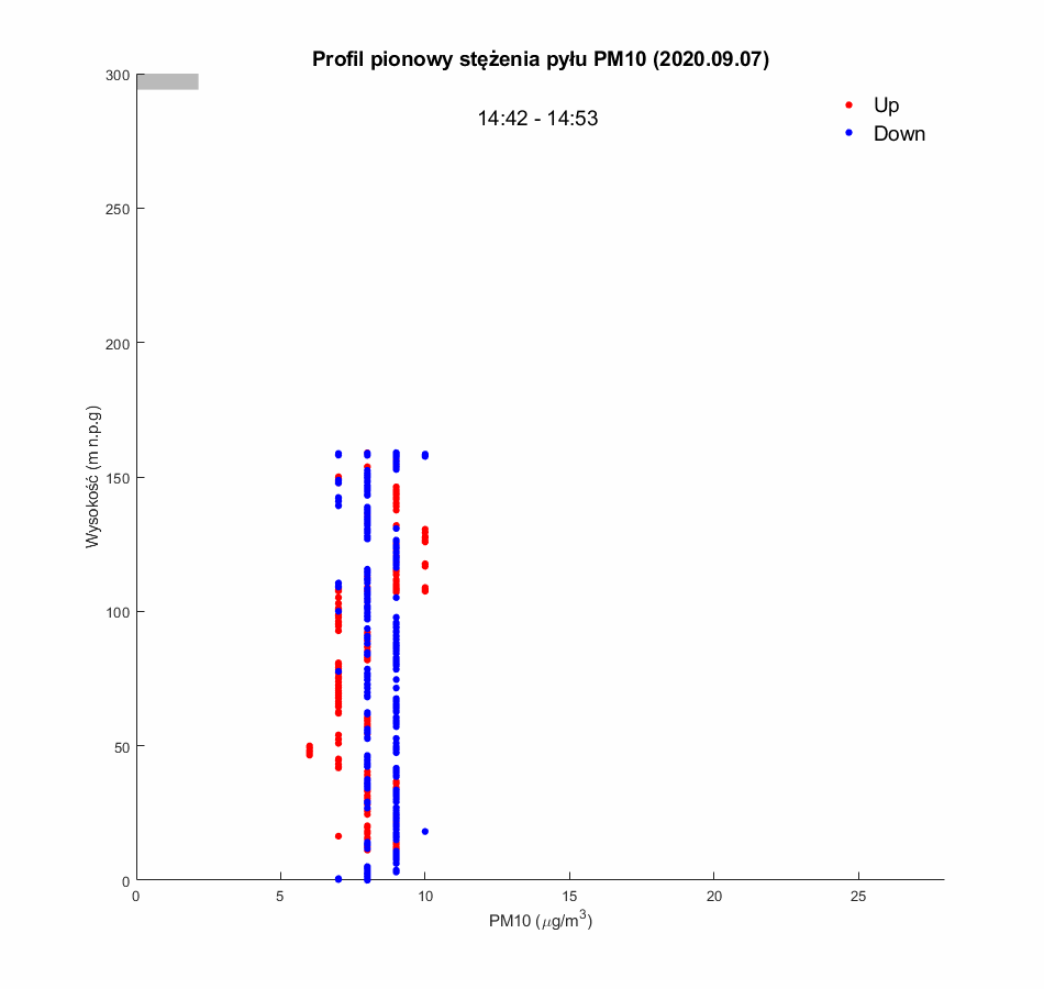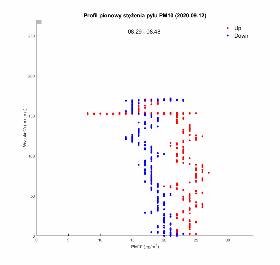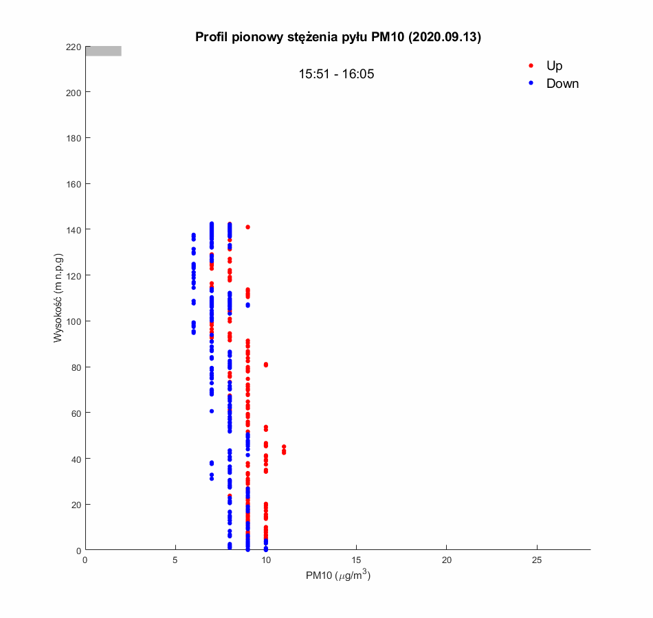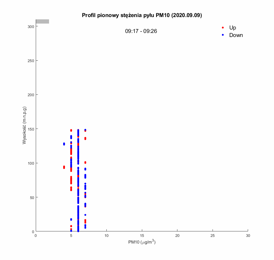 Po wznowieniu lotów balonu widokowego pomiary jakości powietrza zostały uruchomione 5.09.2020. W pierwszej połowie września (5-15.09) wszystkie pomiary PM10 utrzymywały się poniżej 30mg/m3, a większość rejestrowanych wartości była poniżej 10mg/m3. Świadczy to o dobrej jakości powietrza w mieście. Wynika to z wysokich temperatur obserwowanych w tym okresie (temperatura minimalna rzadko spadała poniżej 10ºC, a maksymalne dochodziły do prawie 30 ºC. Towarzyszyła temu słoneczna pogoda i silne konwekcje mieszające powietrze w pionie w ciągu dnia. Potwierdzają to wyniki profili dziennych wykazujących stałą niska wartość PM10 niezależnie od wysokości. Mimo dobrych warunków aerosanitarnych, w okresach porannych i wieczornych obserwowane były zmiany stężenia PM10 z wysokością, co świadczy o występowaniu nocnych inwersji termicznych w dolnej warstwie atmosfery (większość profili wykonanych po 17:00, oraz profile poranne z 5.09.2020), jednak ze względu na niewielką emisje zanieczyszczeń (wysokie temperatury powietrza), amplituda zmian PM10 nie przekraczała 20mg/m3.